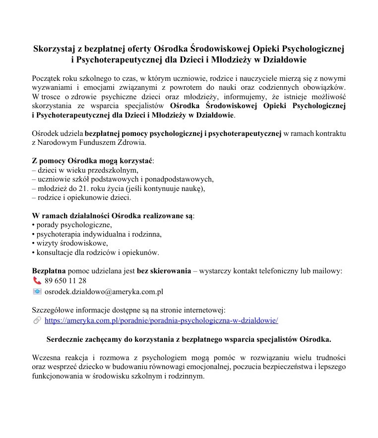 Szczegółowe informacje dostępne są na stronie internetowej: 🔗 https://ameryka.com.pl/poradnie/poradnia-psychologiczna-w-dzialdowie/