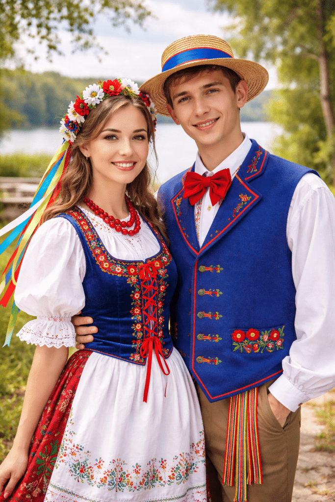 /zdjęcie główne przedstawia młodą parę w strojach mazurskich/