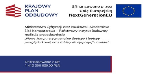 Działanie jest realizowane w ramach Programu Krajowy Plan Odbudowy i Zwiększenia Odporności finansującego przedmiotowe zamówienie ze środków przeznaczonych na realizację wskaźnika C12L „Sale lekcyjne w szkołach zawodowych oraz instytucjach kształcenia ogólnego wyposażone w narzędzia informatyczne w celu umożliwienia nauczania zdalnego” dla inwestycji C2.2.1 „Wyposażenie szkół/instytucji w odpowiednie urządzenia i infrastrukturę ICT w celu poprawy ogólnej wydajności systemów edukacji” w ramach Komponentu C „Transformacja cyfrowa”;