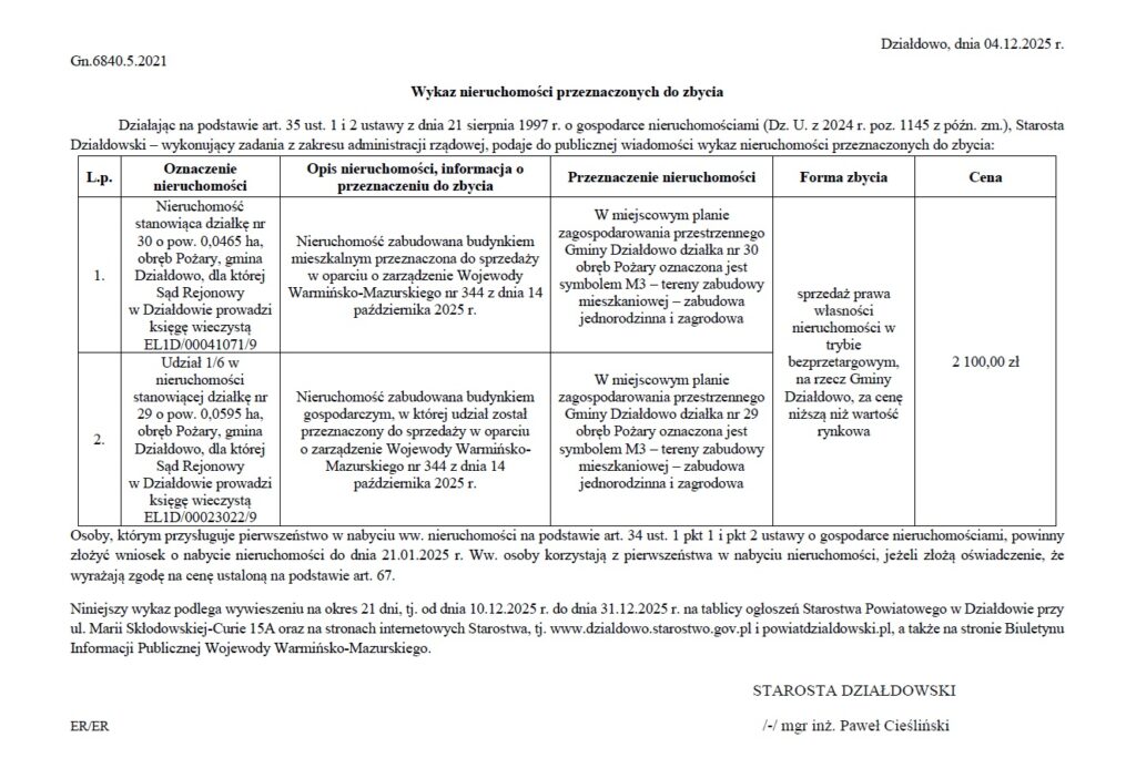 Ogłoszenie Starosty Działdowskiego w sprawie dwóch nieruchomości przeznaczonych do zbycia