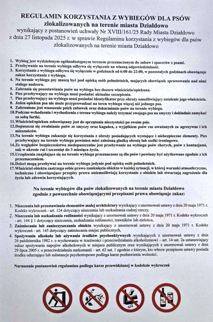 Działdowski „Psi Park” to ogrodzony wybieg obejmujący ok. 650 metrów kwadratowych i umożliwiający bezpieczną zabawę psów bez smyczy. Oferuje obręcz do przeskoków, kładka, tunel, płotki oraz huśtawkę. O ile urządzenia będą odpowiednio używane, to na pewno posłużą na wiele lat. Psy mogą  biegać i bawić się bez smyczy, ale tylko pod nadzorem właściciela. Przy wejściu do parku, który znajduje się przy ul. Świerkowej (za obiektami sportowymi), znajduje się tablica z regulaminem korzystania z obiektu (zdjęcie poniżej).