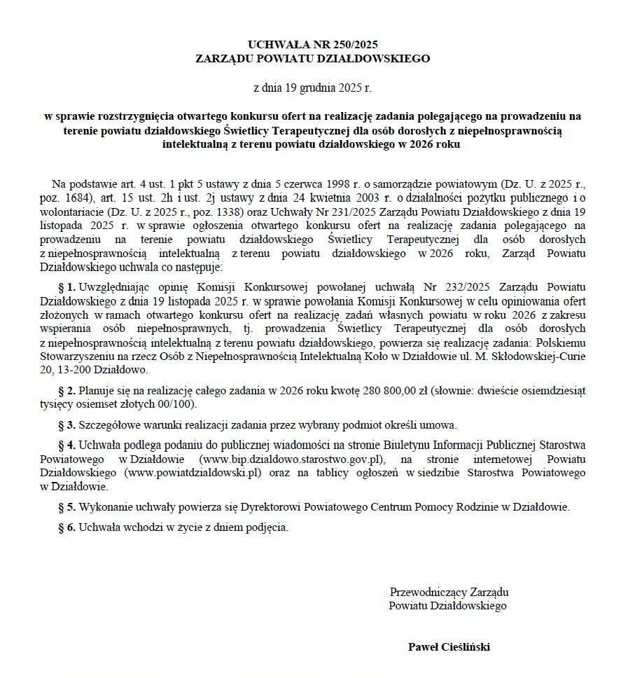 19 grudnia br. Zarząd Powiatu Działdowskiego dokonał rozstrzygnięcia otwartego konkursu ofert na realizację zadania polegającego na prowadzeniu na terenie powiatu działdowskiego Świetlicy Terapeutycznej dla osób dorosłych z niepełnosprawnością intelektualną z terenu powiatu działdowskiego w 2026 roku: