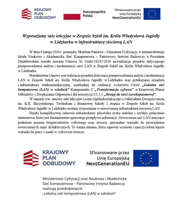 Wyposażamy sale lekcyjne w Zespole Szkół im. Króla Władysława Jagiełły w Lidzbarku w infrastrukturę sieciową LAN!